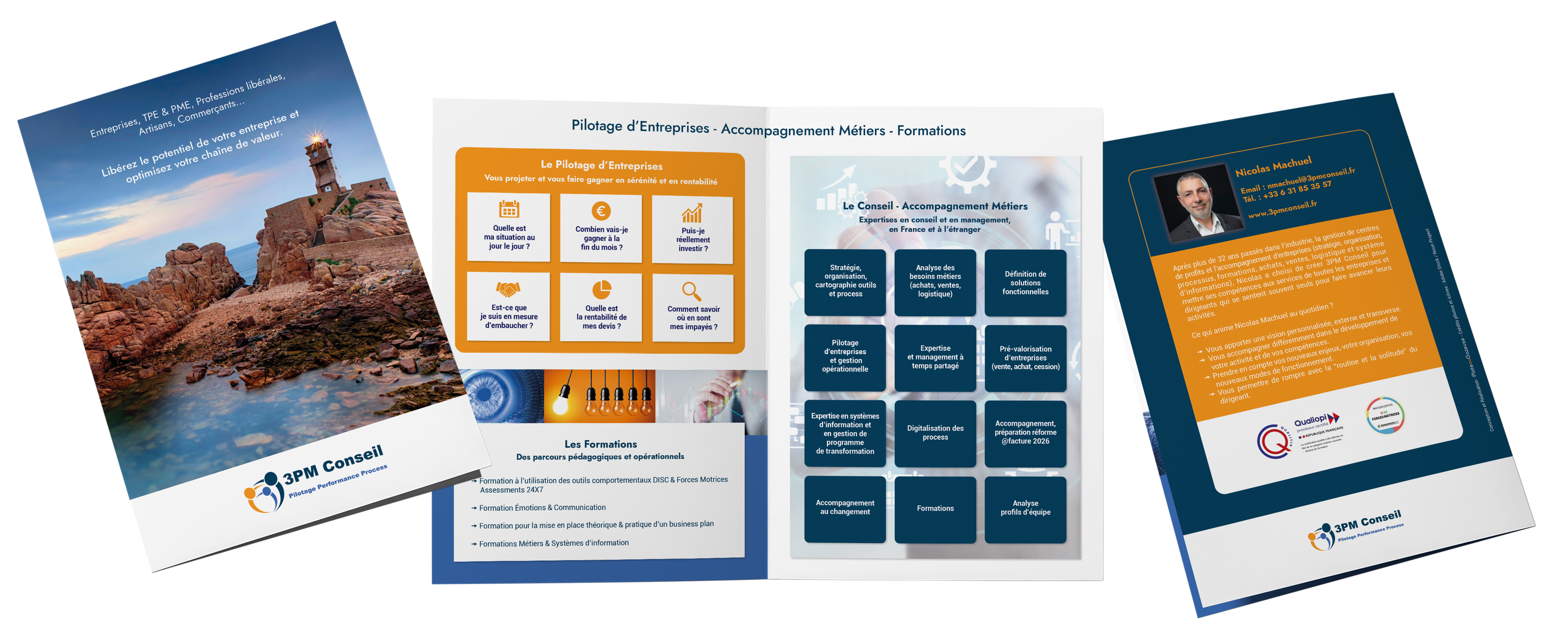 3PM Conseil aide les entreprises et leurs dirigeants de façon à faire avancer leurs activités. Que ce soit du conseil, de l’accompagnement, du pilotage ou des formations, 3PM Conseil est le partenaire adéquat ; il s’agit donc de le faire-savoir.