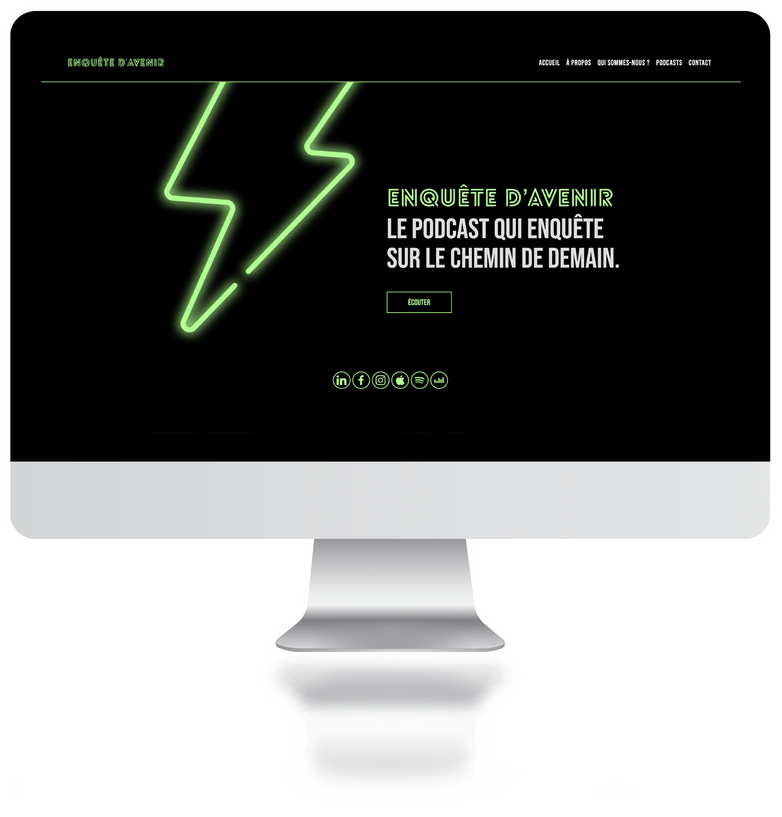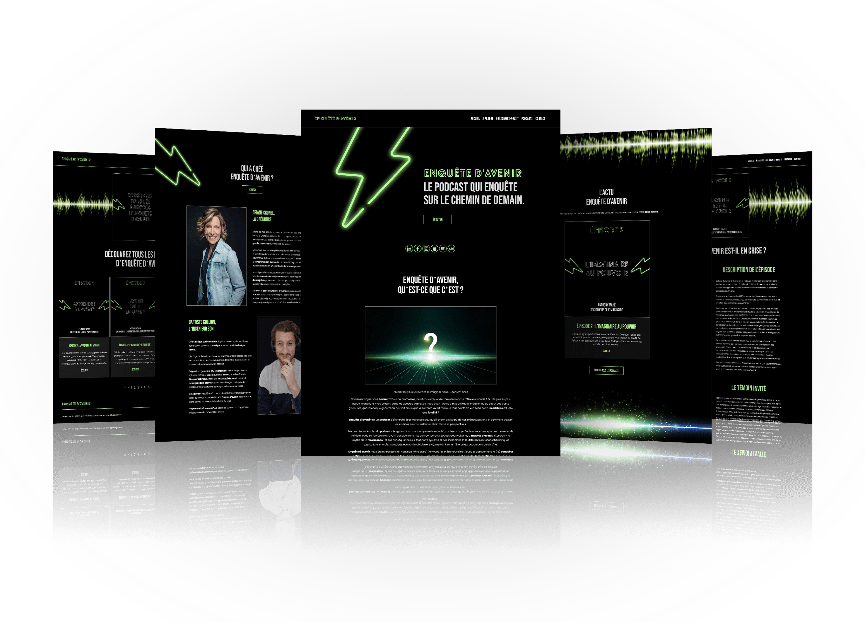 Afin d’avoir une existence sur le web et de pouvoir héberger ses podcasts, Enquête d’avenir a fait appel à Plate ou Gazeuse pour créer une identité forte et concevoir un site internet. Un motion design a aussi été réalisé pour accompagner le lancement du site.
