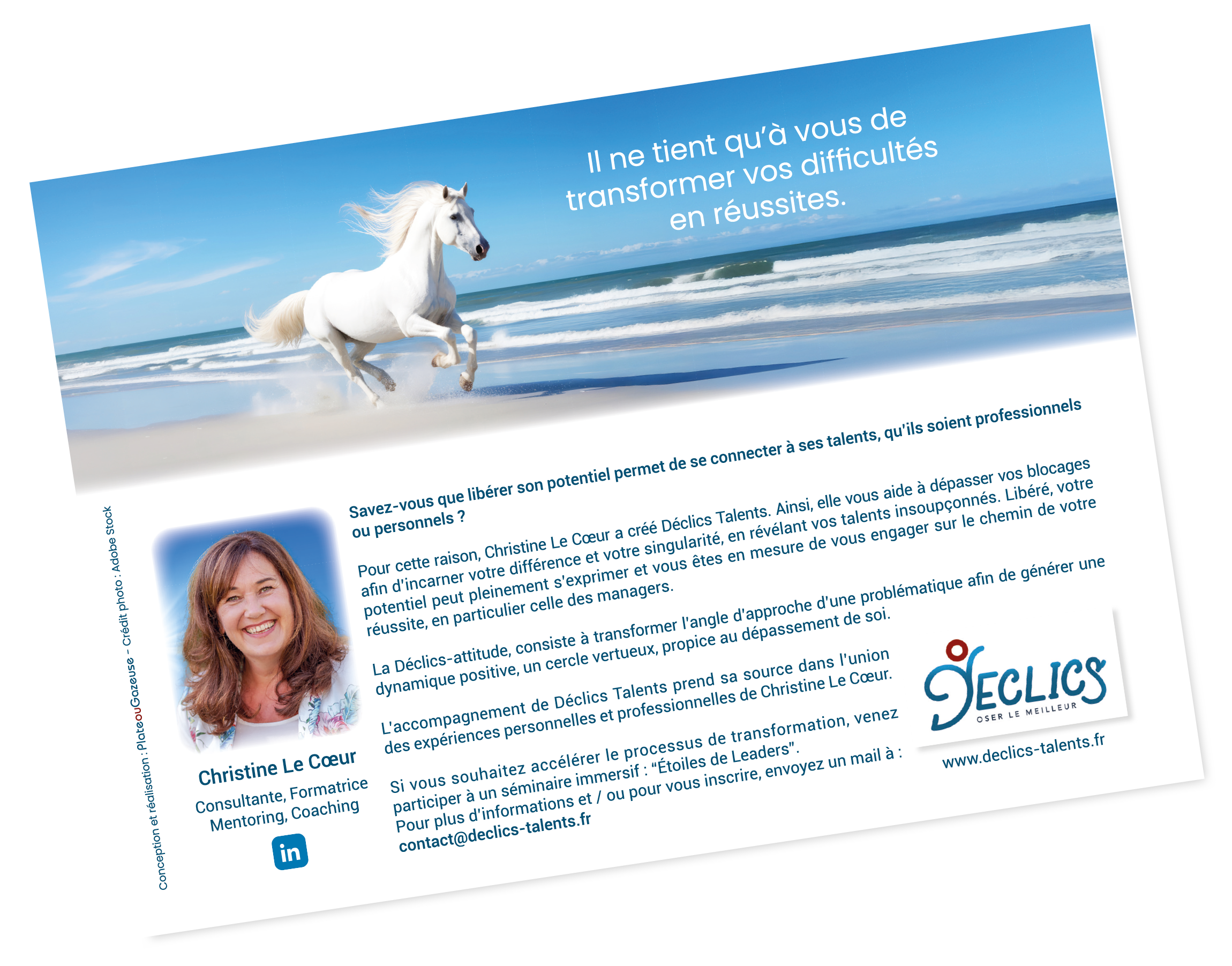 Déclics Talents et plus particulièrement Christine Le Cœur ont fait appel à Plate ou Gazeuse afin de concevoir une signature publicitaire, ainsi qu’une annonce presse en format demi page, en vue d’une parution dans un magazine de la ville de Poissy. L’objectif de cette parution est de promouvoir les services de coach de managers de cette société, ainsi que d’annoncer la tenue d’un séminaire immersif.